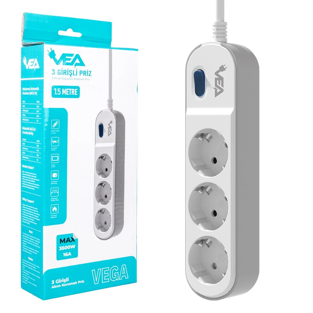 Vea VE-VEGA103 A Class 3’lü Anahtarlı 1.5 Metre Akım Korumalı Priz